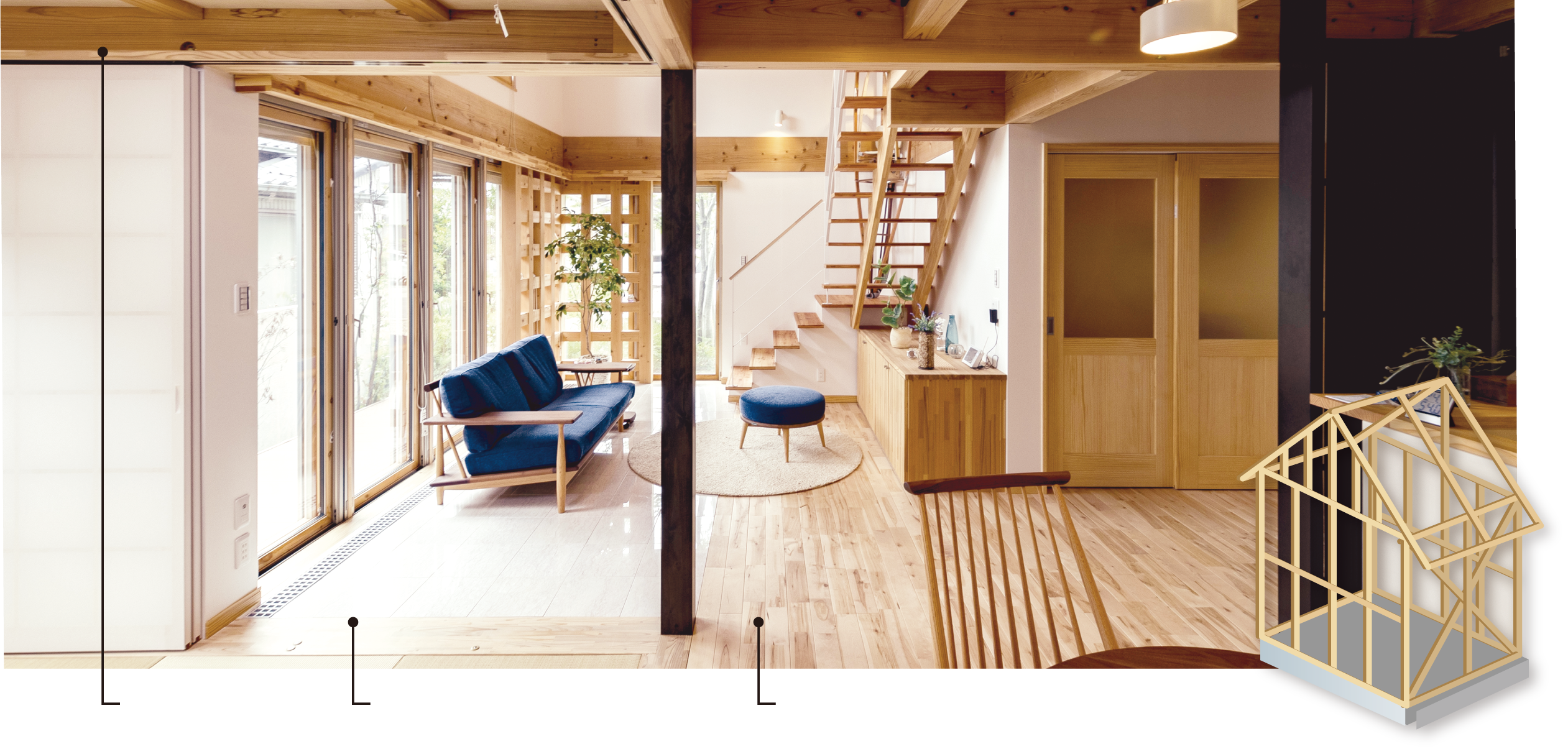 度重なる震災にも耐え抜く強い構造と、高性能な木材、建材は、家づくりで最も重視していただきたい最重要要素です。私たちは真剣に、徹底的に、健康と命を守る家づくりをご提案します。