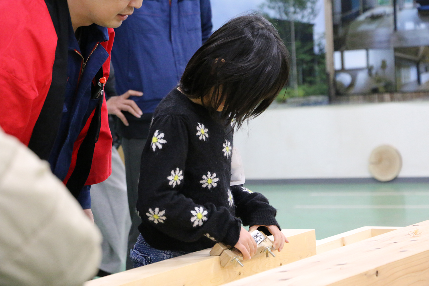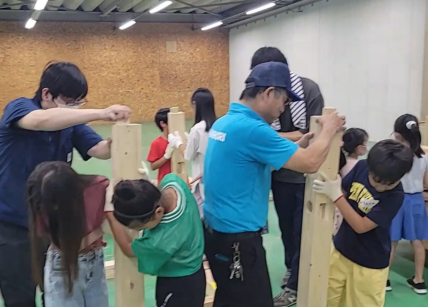 シンホリラボでの一番人気「家の建て方体験」。柱を組み合わせて家の骨組みを作り上げる、別名「棟上げ体験」です。コンコン、カンカン・・・どんどん家の骨格ができあがる様子に感動!家づくりの基礎を、親子で楽しみながら体験していただけます。